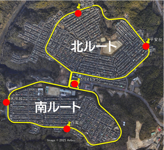 停留所:「ホワイトタウン」⇒「桃山台」⇒「平安台」⇒「ホワイトタウン」