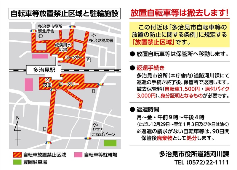 多治見市では、良好な都市環境を保つためJR多治見駅周辺の広場や道路上など公共の場所に自転車等の放置禁止区域を定めています。放置禁止の対象は、自転車及び原動機付自転車(50cc未満)です。