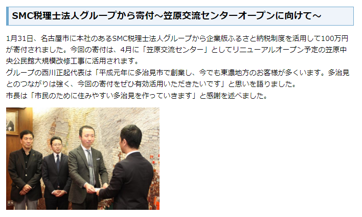 | SMC税理士法人 | 100,000 | 「共につくる。まるごと元気!多治見」 |